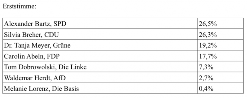 Die SPD erzielte mit 23,8 % der Zweitstimmen das höchste Ergebnis und stellt so auch nach Meinung der jungen Leute den Bundeskanzler. Dicht gefolgt von der FDP, die ein Ergebnis von 22,3 % einholte. „Im Vergleich zum deutschlandweiten Juniorwahlergebnis hat die FDP am AMG stärker abgeschnitten“, meint Matthias Weisenstein, „die CDU sichert sich hier aber nur ein schwaches Ergebnis mit 13,5 %.“ Bei den Erststimmen sieht es mit der CDU aber anders aus: Mit 0,2 % verfehlte Silvia Breher aus der CDU den Spitzenkandidaten Alexander Bartz von der SPD nur knapp. „Im Deutschlandvergleich liegt das AfD-Ergebnis höher als an unserer Schule“, erklärt der Politiklehrer, hier holte die AfD 3,5 % der Stimmen. Die Grünen erhielten 21 % der Stimmen und die Linke 6,6 %.