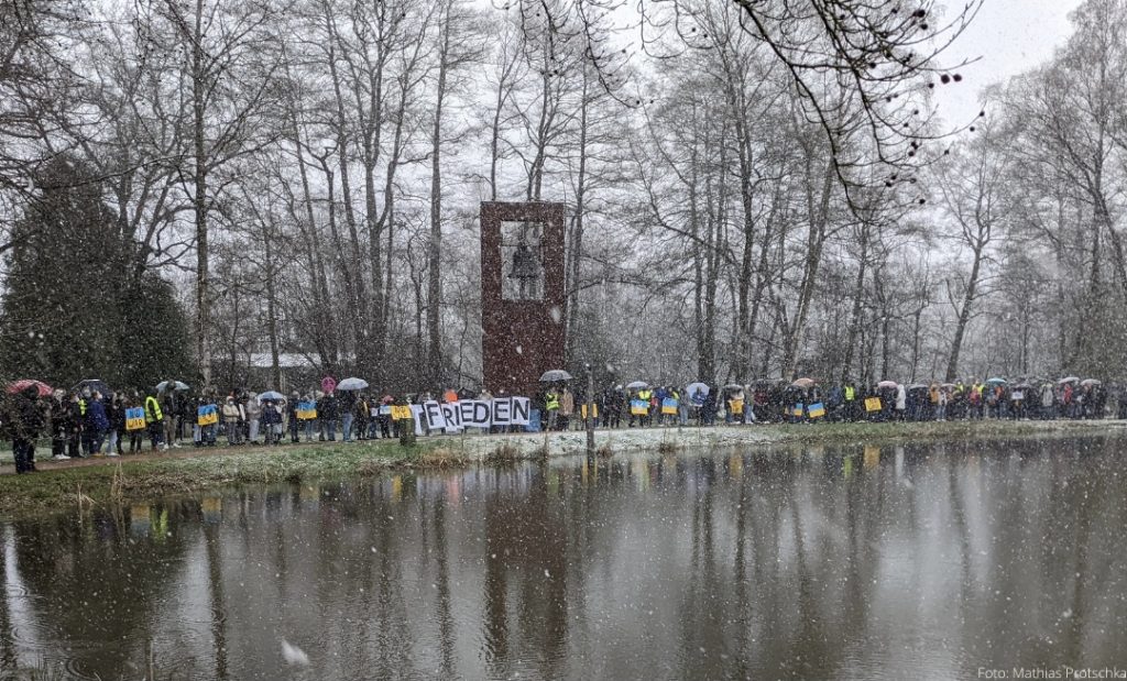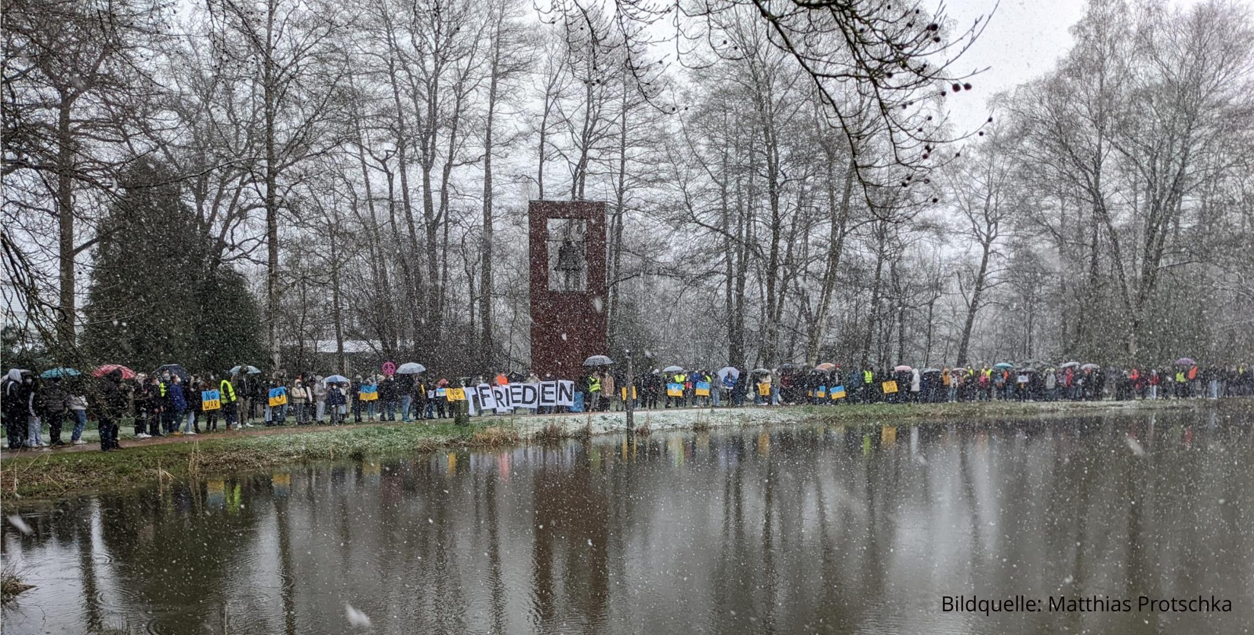 Also machten sich gestern alle Klassen, Kurse und Lehrkräfte trotz des Schneefalls in der 3. Stunde auf den Weg in den Stadtpark. Dort angekommen wurden Schilder und Plakate, die an den Tagen zuvor in der Schule erstellt worden waren, an die Schülerinnen und Schüler ausgeteilt, die sich rund um den Teich aufstellten. Nach der Rede von Schülersprecherin Anna Eilers, in der an die vielen Toten in der Ukraine und die Millionen geflüchteter Menschen erinnert wurde, läutete während einer Schweigeminute die Friedensglocke. Im Anschluss daran wurde ein Lied gesungen, das von der Fachgruppe Musik vorbereitet worden war.