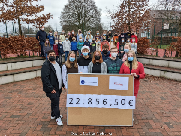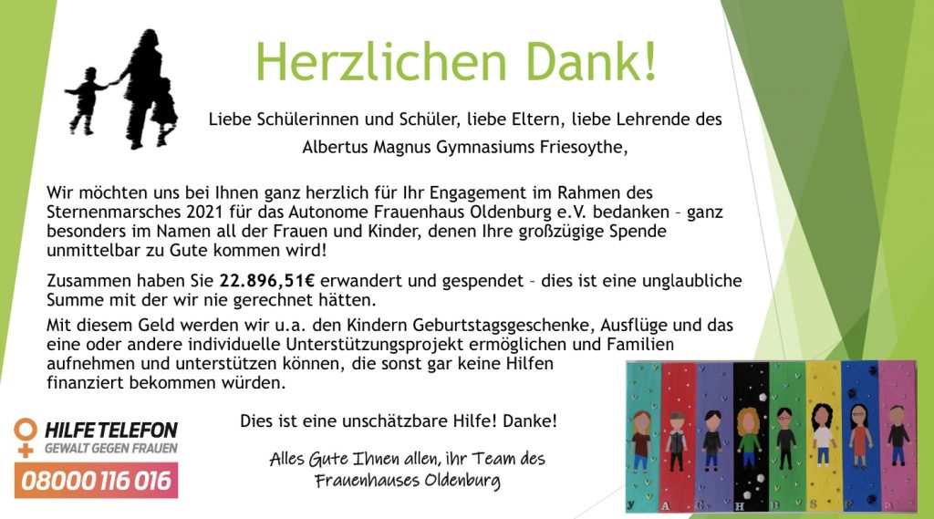 Am Freitag, den 19. November, fand der alljährliche Sternmarsch am AMG statt. Dabei wurde eine stolze Summe von 22.856,50 Euro gesammelt, die dem Autonomen Frauenhaus Oldenburg zugutekam. In diesem Zuge sammelte die 5d von Herrn Hagen, die auf dem Foto mit der Schülervertretung zu sehen ist, als Klasse mit 1.411,20 Euro den größten Betrag zur Gesamtspende. Das Frauenhaus in Oldenburg nimmt Frauen und Kinder auf, die in ihrem zu Hause nicht mehr sicher sind, und bietet einen Schutzraum vor häuslicher Gewalt. Mit Spendengeldern finanzieren sie zum Beispiel die Einrichtung, eine Erstausstattung der Schutzsuchenden oder besondere Ausflüge mit den Kindern. Ebenso begleitet und unterstützt das Frauenhaus die Betroffenen bei Behörden oder bei der Wohnungssuche und vermittelt gegebenenfalls an weitere Hilfseinrichtungen.