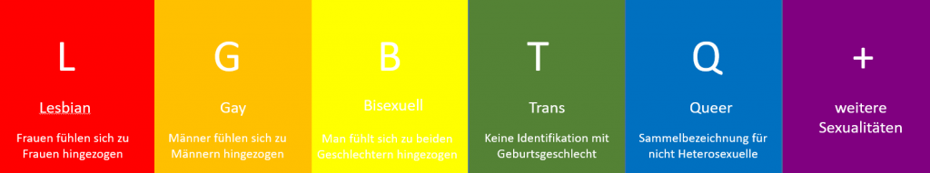 Transmenschen sehen sich häufig in der LGTBQ+-Community wieder. Zu dieser Gruppierung gehören aber nicht nur Menschen, die sich nicht mit ihrem Geburtsgeschlecht identifizieren, sondern beispielsweise auch homo- oder bisexuelle Personen. Das +-Zeichen steht für weitere Sexualitäten und Geschlechtsidentitäten. „Queer“ ist der Oberbegriff für alle, die sich nicht als heterosexuell identifizieren. Liebe und Sexualität beschränkt sich nicht nur auf heterosexuelle Paare, es müssen sich nicht zwangsläufig nur Mann und Frau lieben. Genauso normal sind auch Beziehungen zwischen Mann und Mann oder Frau und Frau.